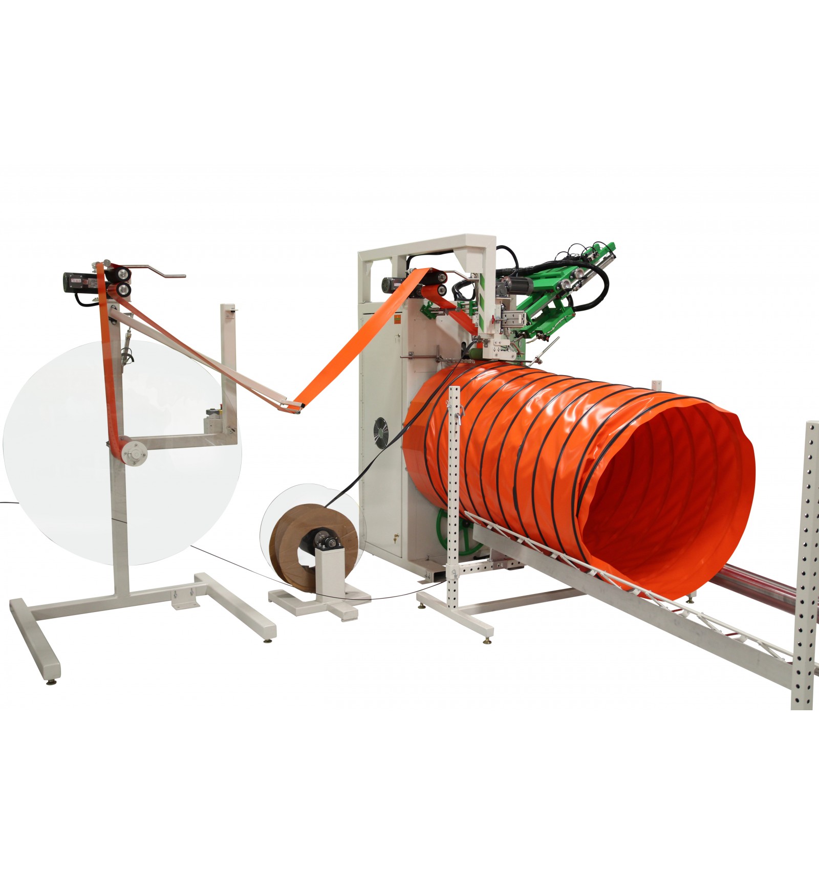 FX-100 Macchina per tubi flessibili condotti La macchina FX100 è stata appositamente progettata per la produzione di tubi flessibili o condotti a spirale. Questa macchina può saldare condotti a spirale da 5 cm a 122 cm di diametro. L'FX100 può anche aggiungere facilmente una striscia di rinforzo all'esterno. Tutte queste operazioni vengono eseguite simultaneamente e automaticamente.
